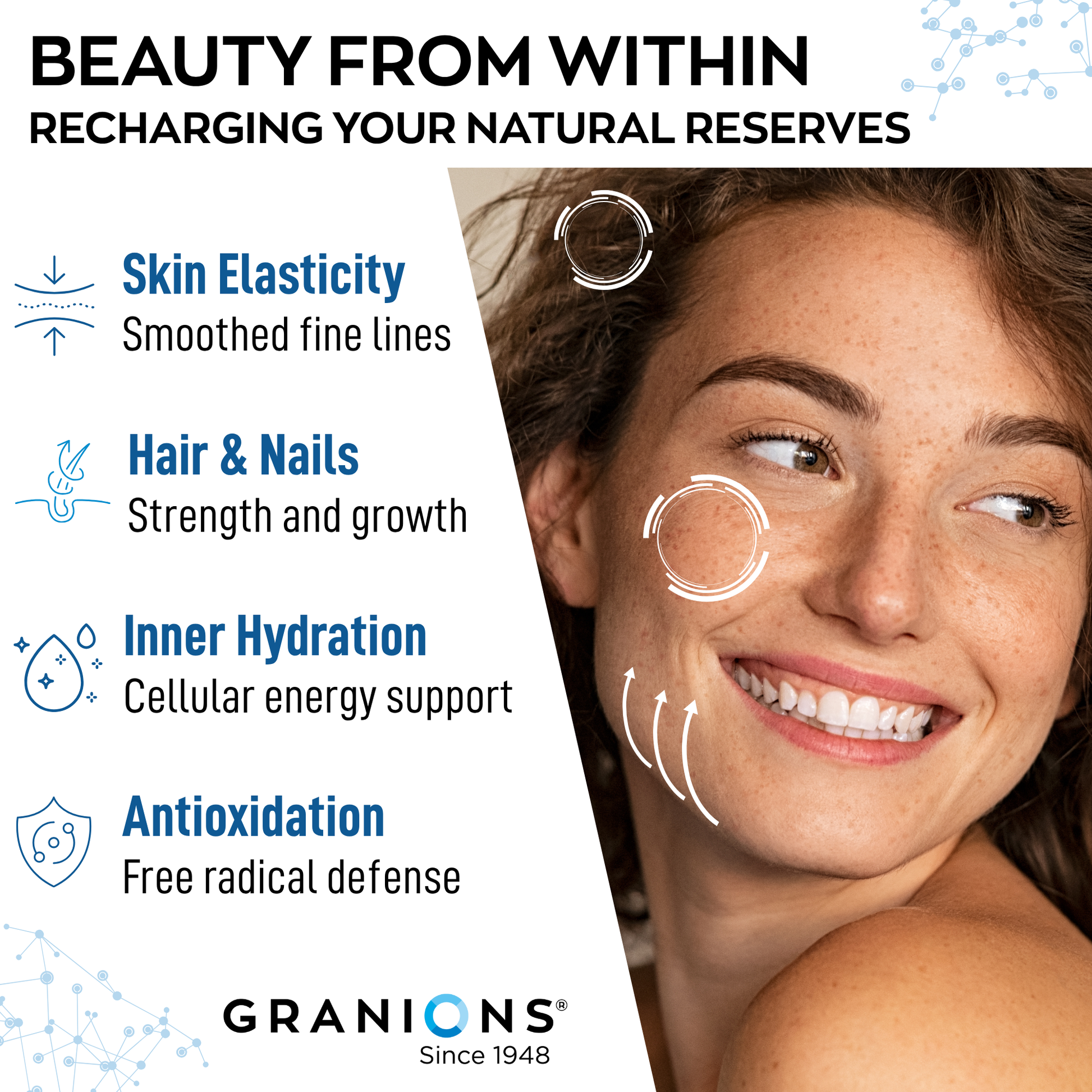 9,000mg hydrolyzed marine collagen peptides promote firm skin, strong hair, and resilient nails with high bioavailability.
